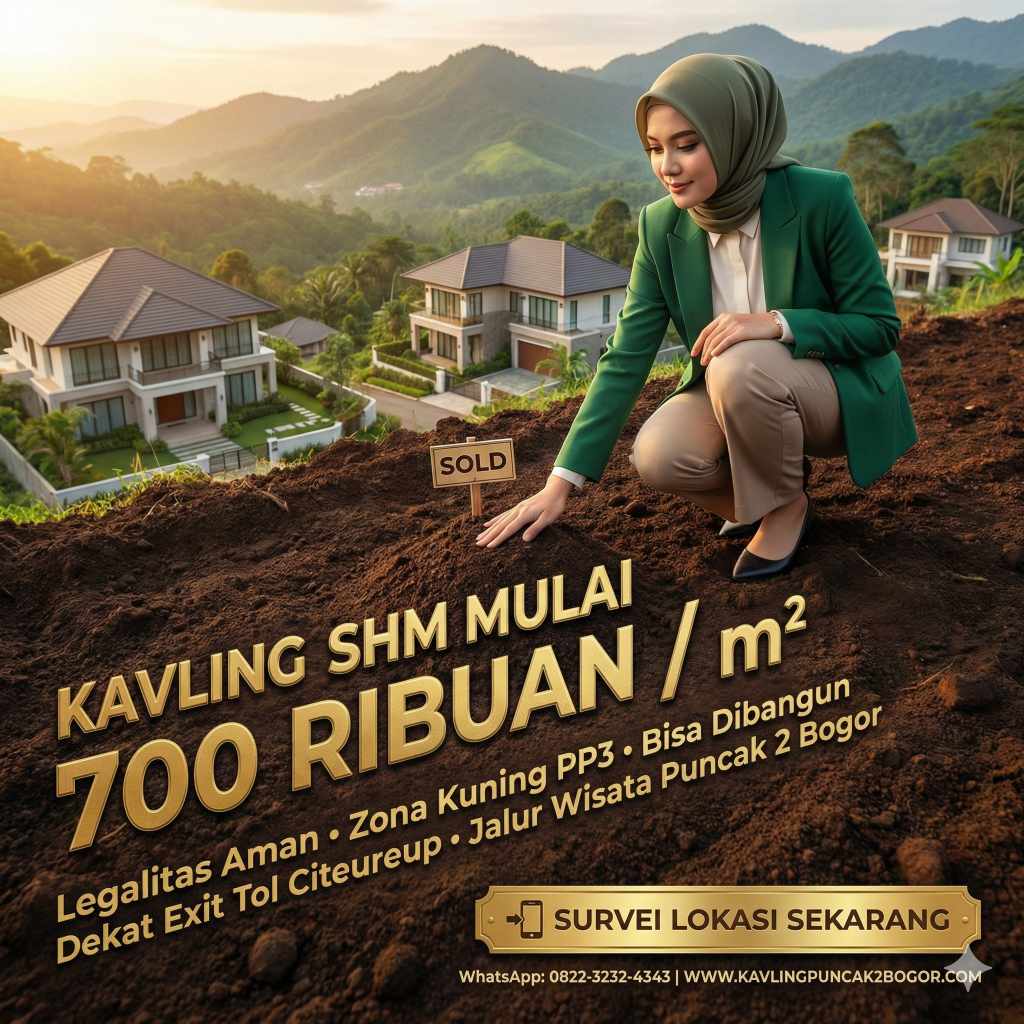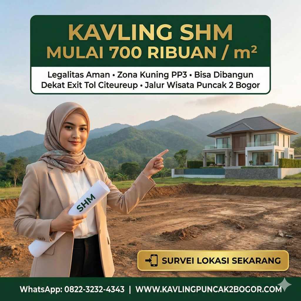 Proyek ini cocok untuk investor yang mengutamakan keamanan hukum melalui tanah SHM pecah sertifikat, berbeda dengan kavling yang masih menggunakan sertifikat induk. Kombinasi lokasi strategis, legalitas terjamin, dan potensi perkembangan kawasan Puncak 2 Bogor Timur menciptakan peluang investasi tanah dengan risiko minimal dan prospek capital gain menarik.